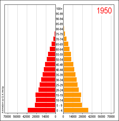 Piramida ludności Chin (poniżej) od 1950 do 2050 (oczekiwana) pokazuje wpływ polityki „tylko jedno dziecko”, która została wprowadzona w 1979 roku z powodu ekstremalnego wzrostu populacji.